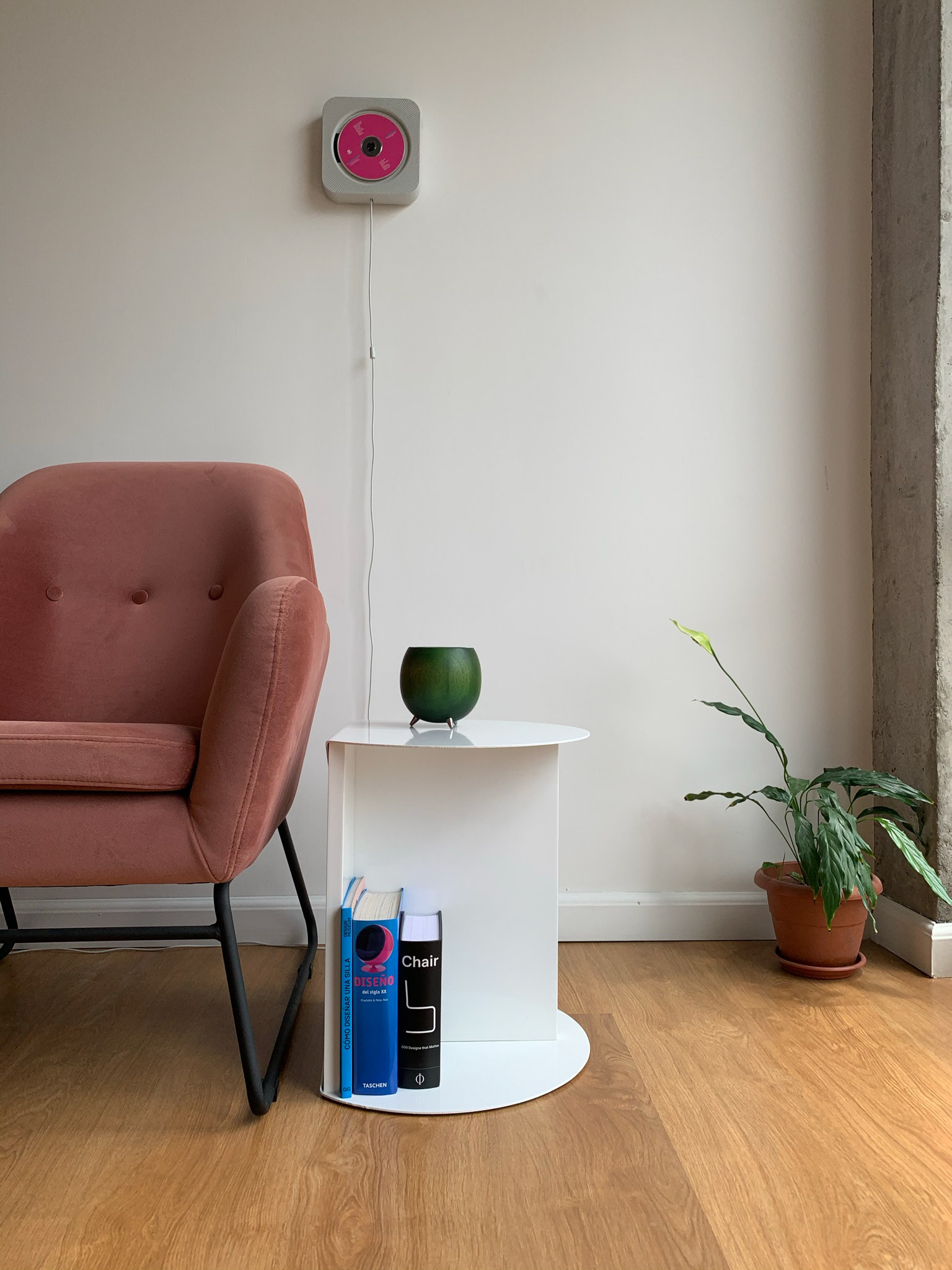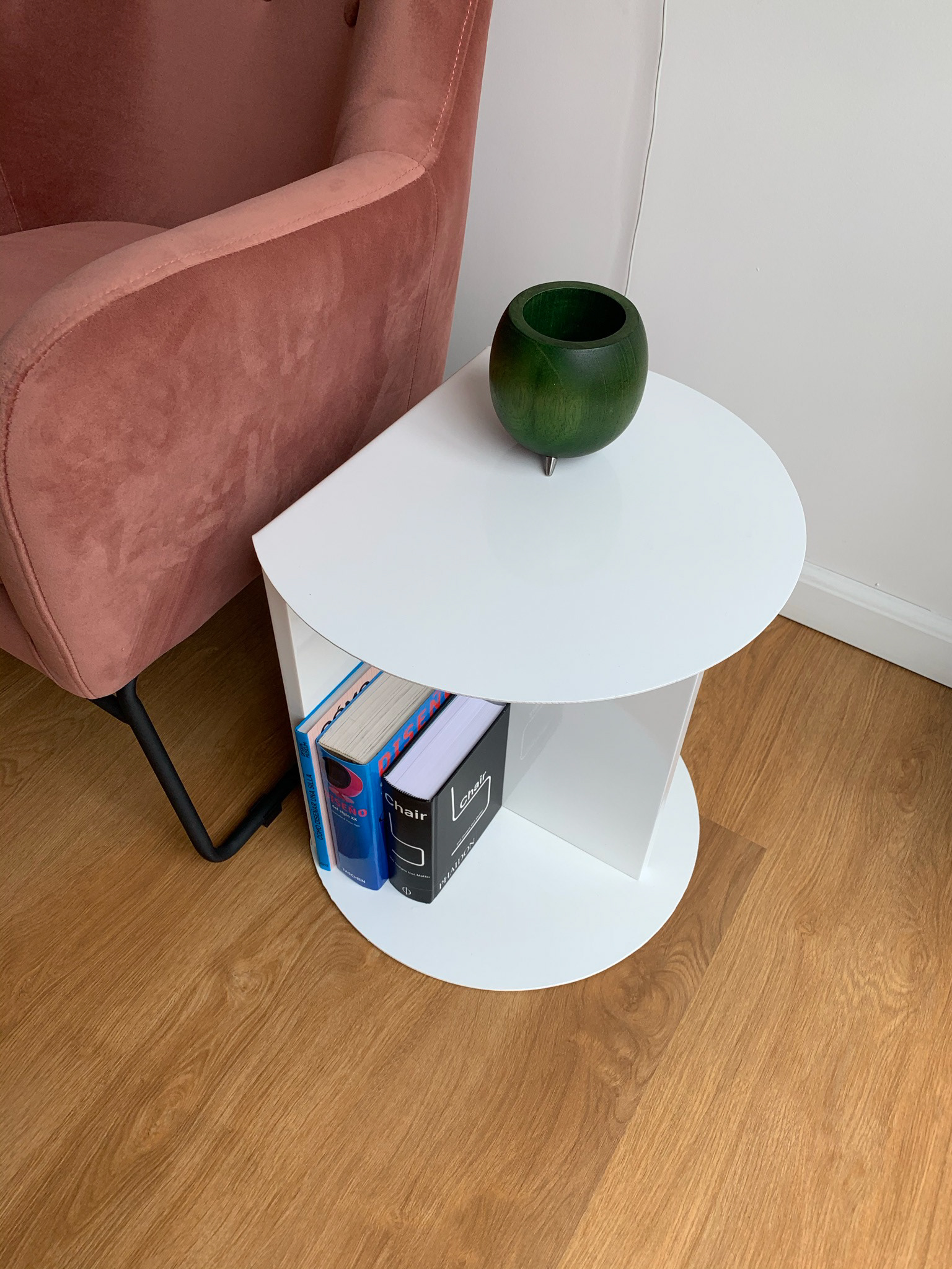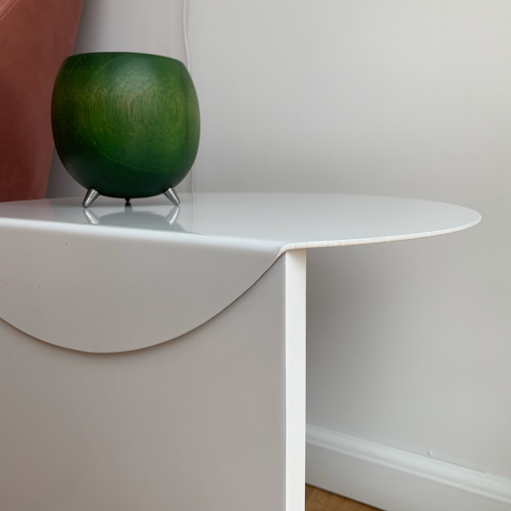 A simple side table fabricated in lacquered metal and MDF.