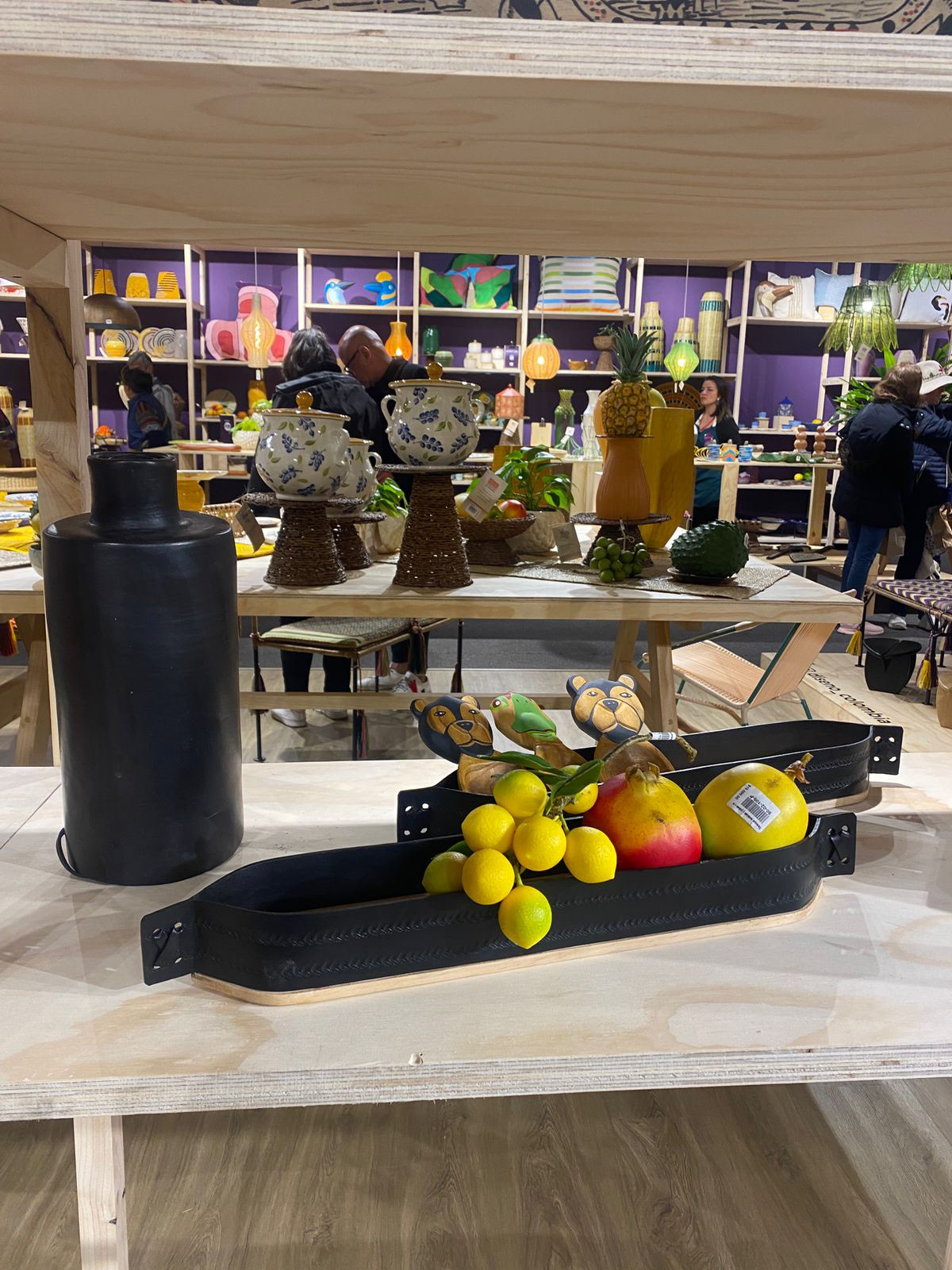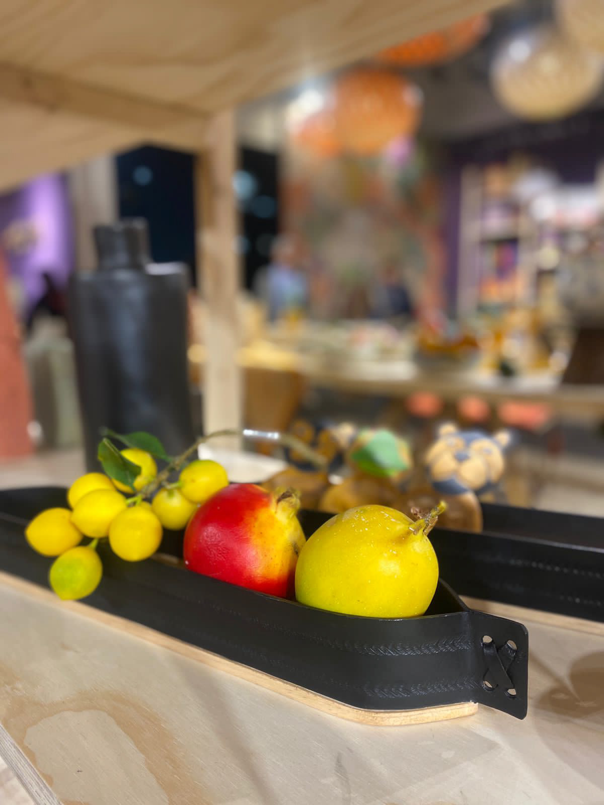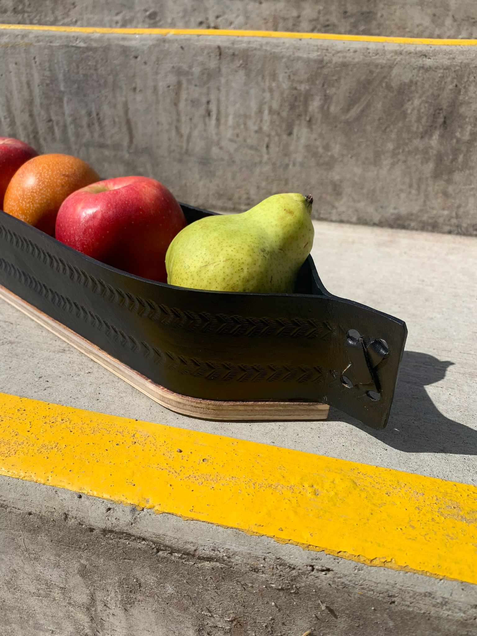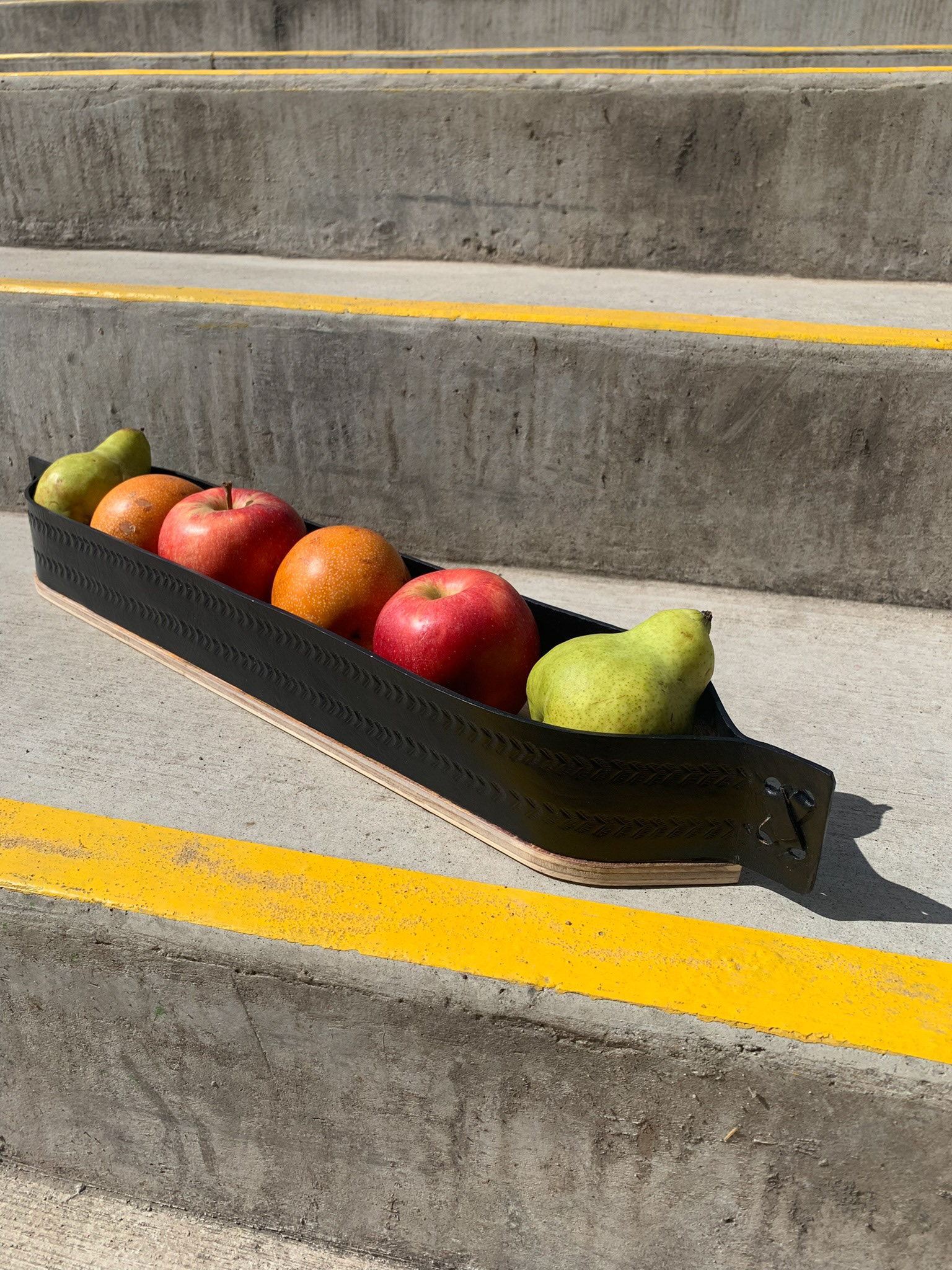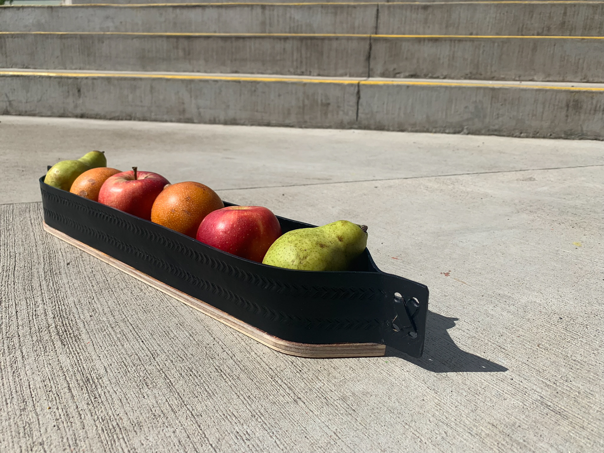 Embossed leather (cuero repujado) fruit bowl with plywood base, mixing traditional technique with CNC cutting.